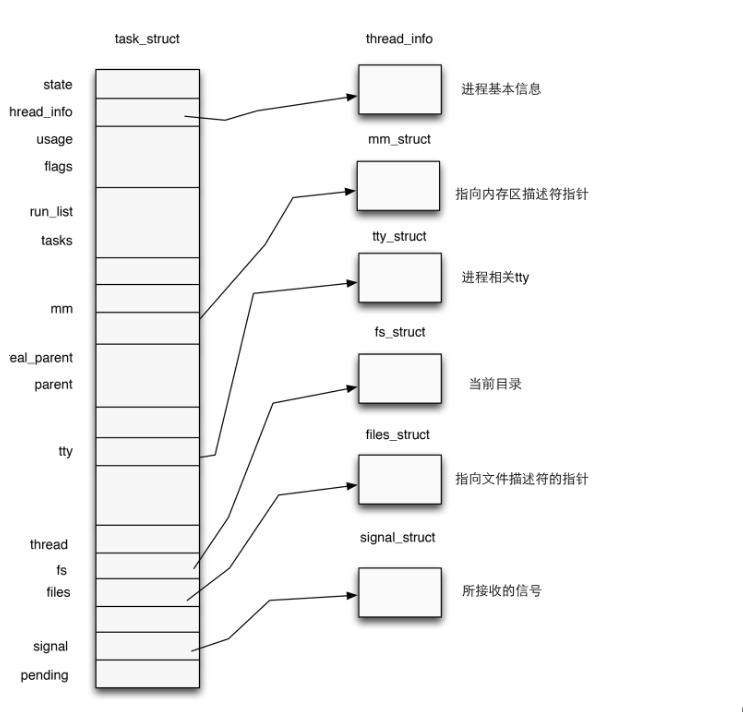 在内核中使用结构体 task_struct 表示一个进程,该结构体定义于内核源码 include/linux/sched.h 中,代码比较长就不在这里贴出了。