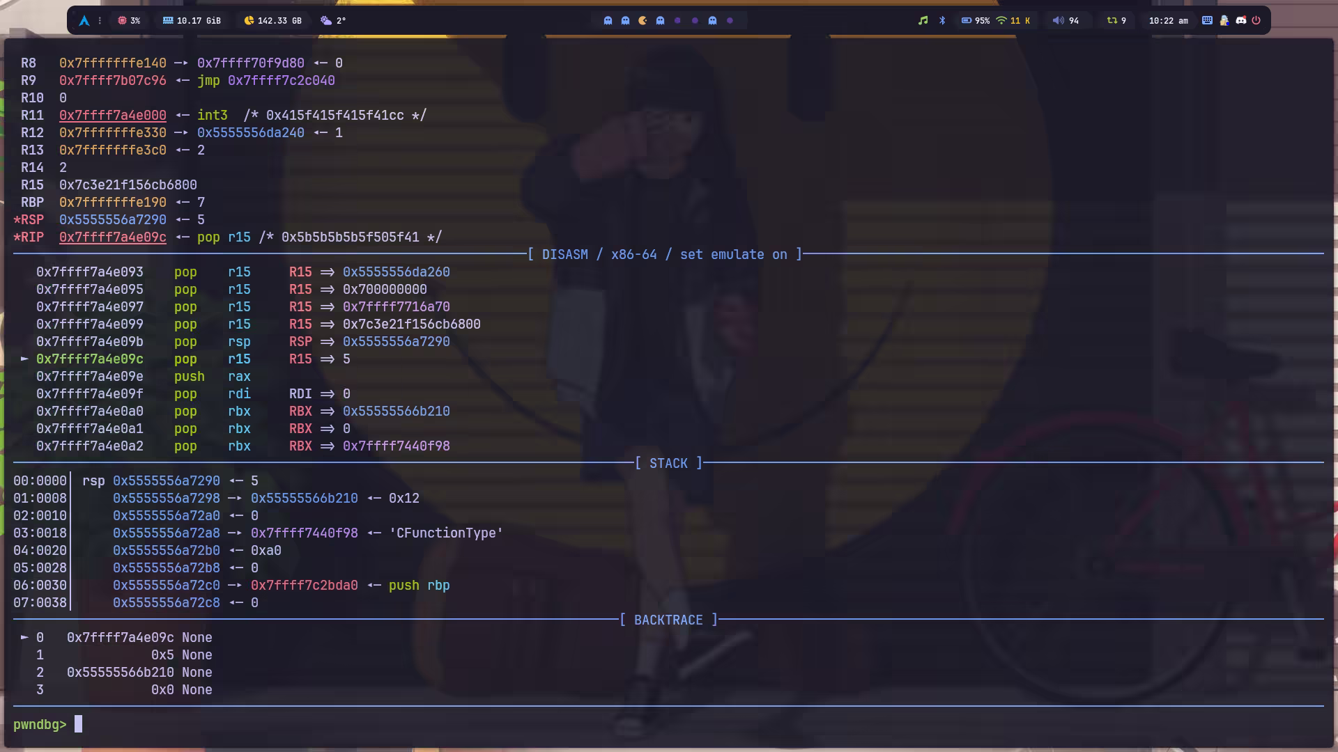 print( f"pid is: {os.getpid()}\nmem: {hex(ctypes.addressof(ctypes.c_char.from_buffer(mem)))}" ) input("DEBUG") func()