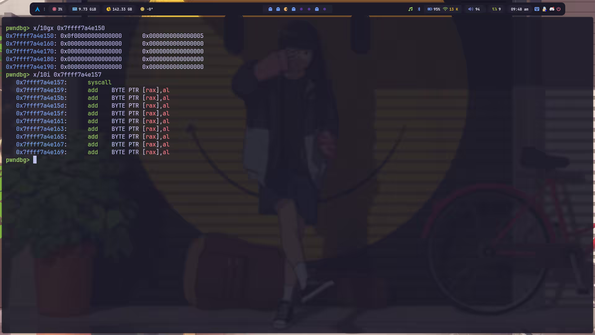 λ ~/ pwn asm -c amd64 "syscall"0f05那我们只要想办法弄到 \x0f 和 \x05 就成功了一半。观察内存,发现有一个现成的 \x05:
